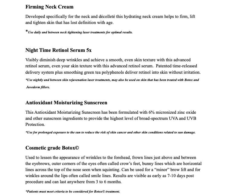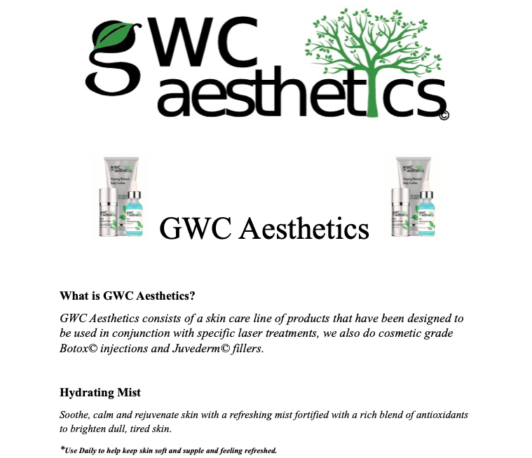 GWC Aesthetics consists of a skincare line of products that have been designed to be used in conjunction with specific laser treatments, we also do cosmetic grade Botox© injections and Juvederm© fillers.